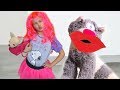 Niki pretend play makeup toys with animals. She makes funny hair and paints nails and lips.